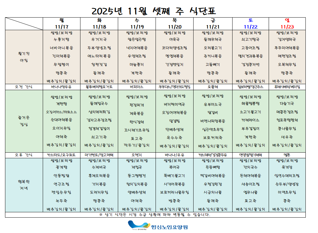 한신노인요양원2025년 11월 셋째 주 식단표 입니다.