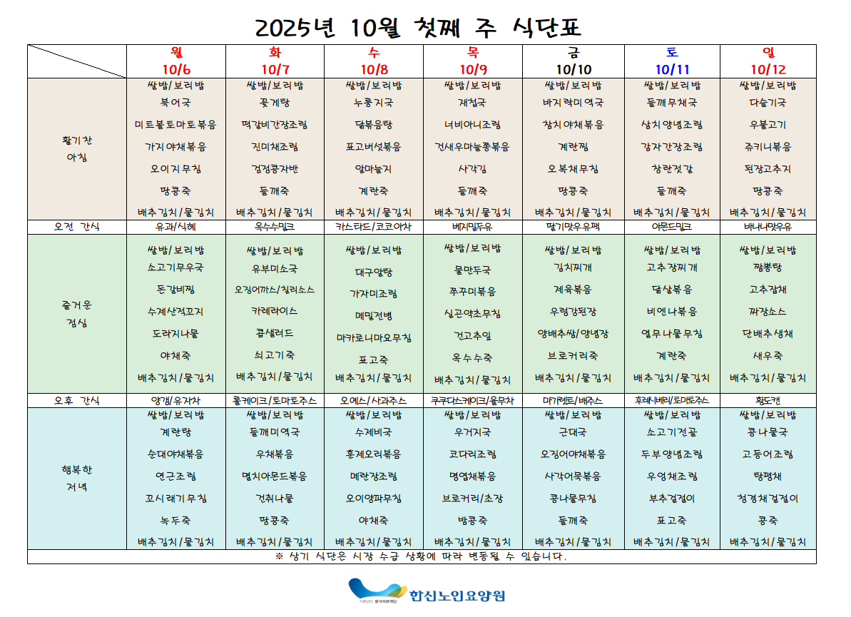 한신노인요양원 10월 1주차 주간식단표 입니다.